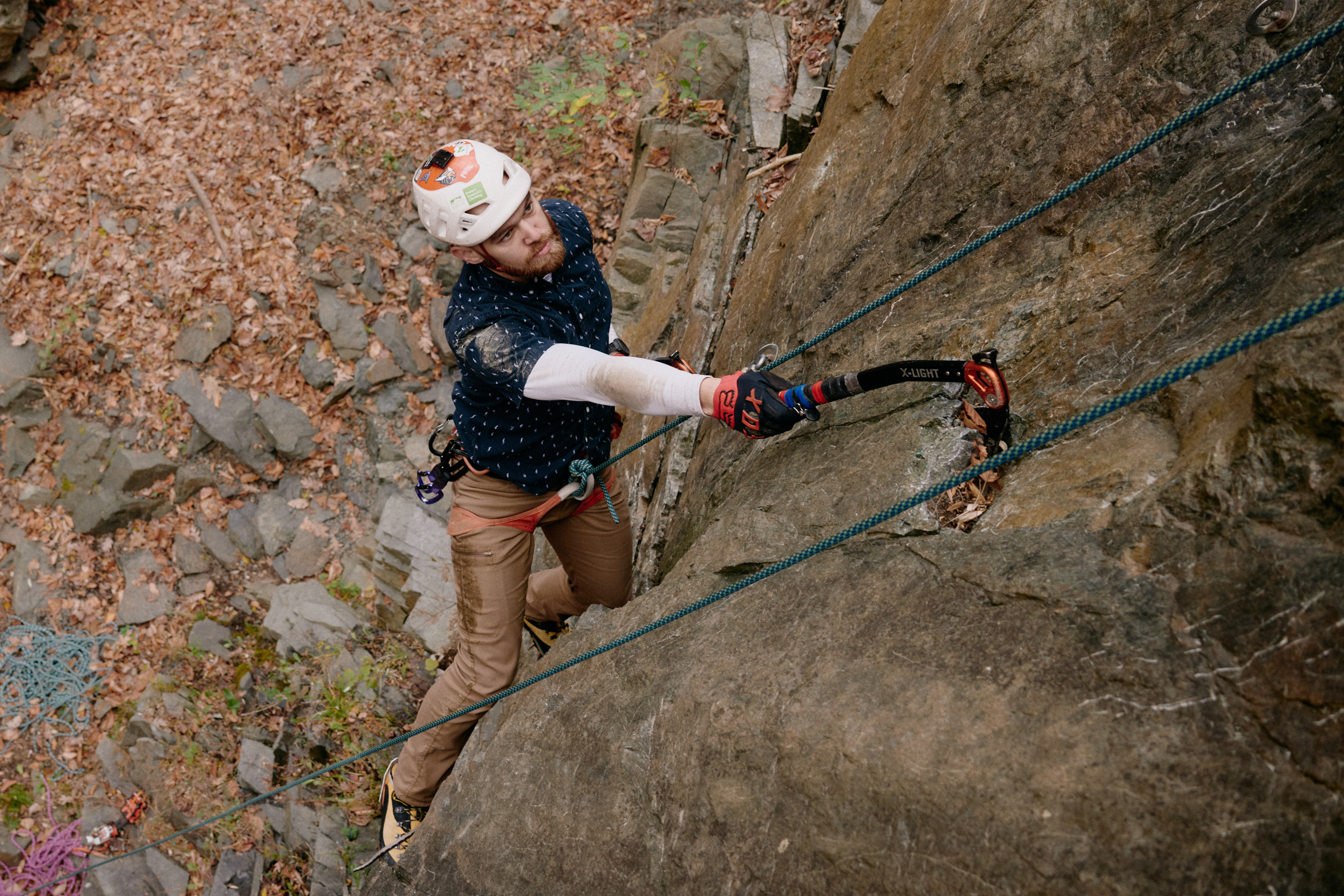 It wouldn’t be a fall day without coffee and donuts, and after intros we scatter throughout the crag, which sports more than 30 bolted drytooling routes. I help set up three top ropes, and then spend most of my time hanging off a fixed line, filming and cheering as climbers cautiously scratch, hook, and torque their way vertically. With trembling breaths and darting eyes, they search for natural features or drilled pockets marked by green paint.